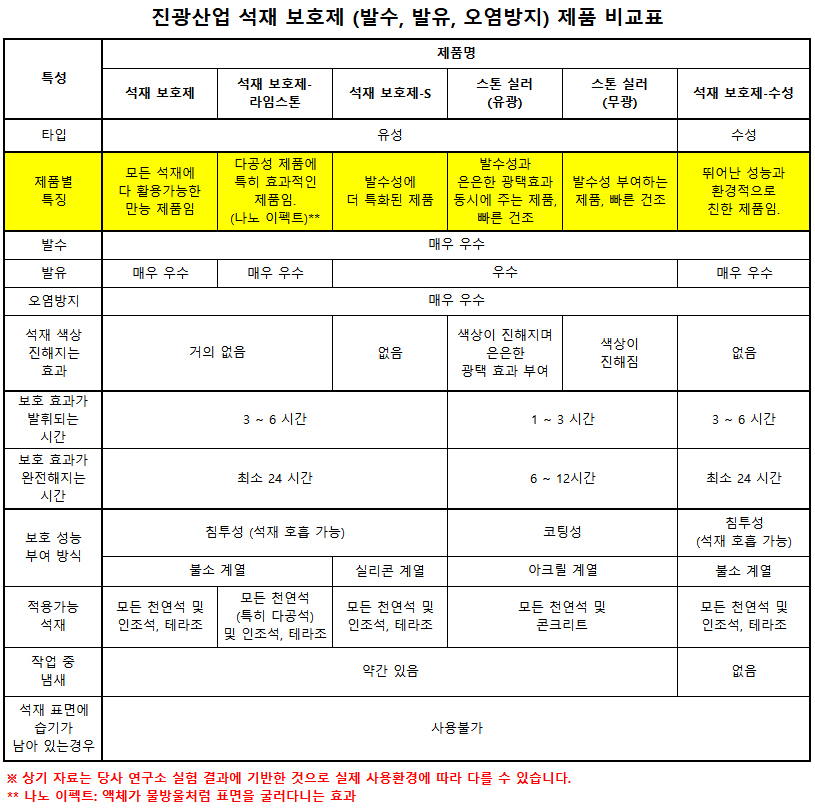 수성제품은 환경 친화적이며 냄새가 거의 없으며 성능이 유성제품과 동등 혹은 유성제품보다는 아주 약간 다소 떨어지나 당사의 "석재 보호제-수성" 제품은 미국, 칠레에서
